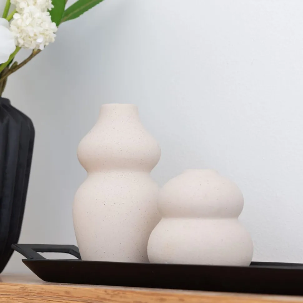 Sand beige matte curved vase, 5,5″. With its pottery-like finish, this pot will be much sought-after piece to recreate a Mediterranean-inspired space. All you need to do is combine it with artificial olive tree branches!