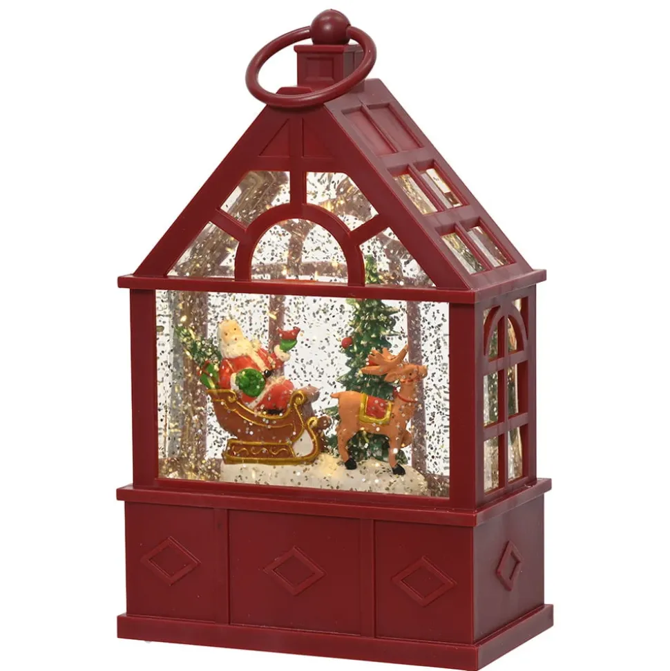 Santa’s on his sleigh lighted lantern, 10″. Inside this snow globe is a captivating scene featuring Santa Claus in his famous red outfit, and his sleigh! The glittering snowflakes falling gently from the branches create a magical atmosphere. Batteries required: 3 x AA. 6-hour timer.