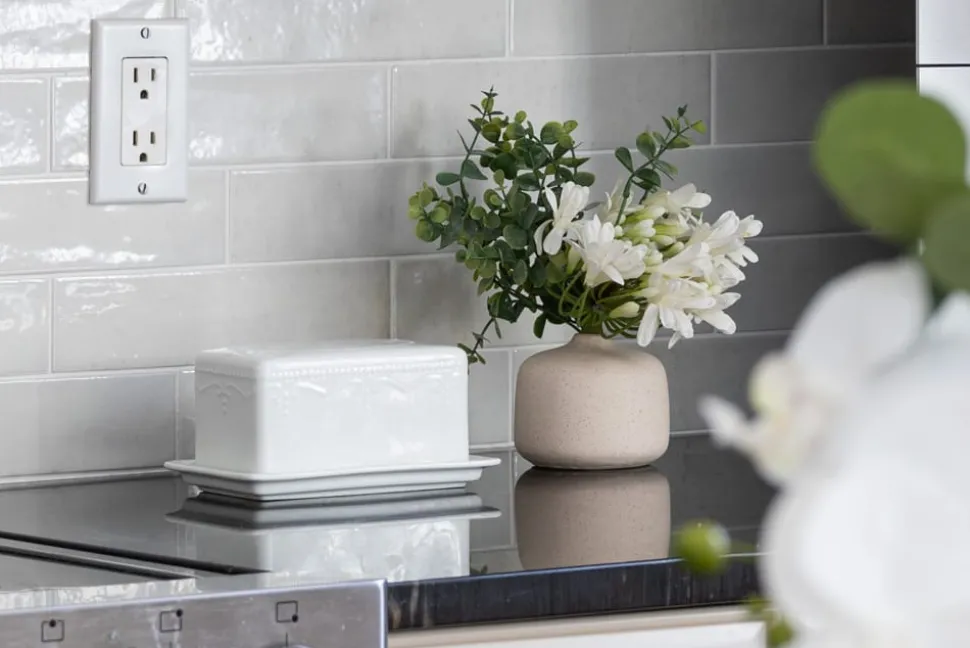 Add a delicate floral touch with this small arrangement of white flowers and eucalyptus. Whether on a sideboard, a desk or simply placed on a shelf, it’s the perfect complement to your decor! Comes in a beige flower vase.