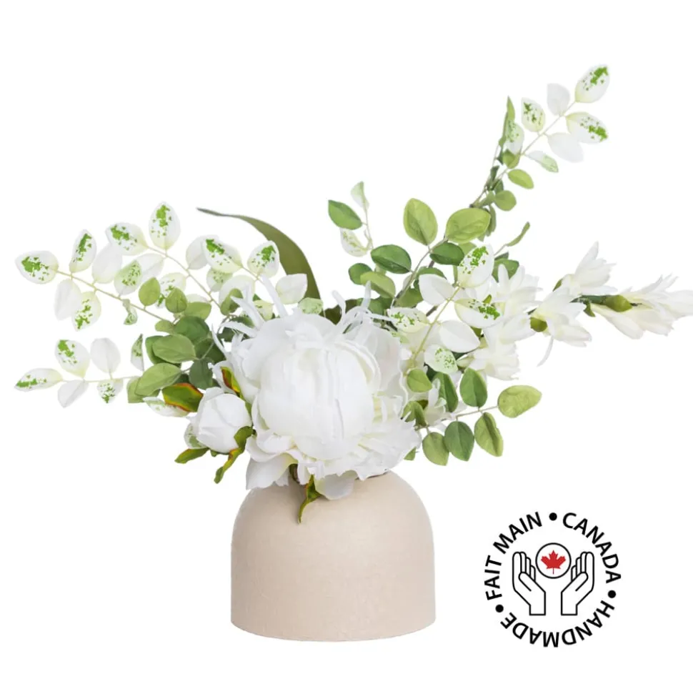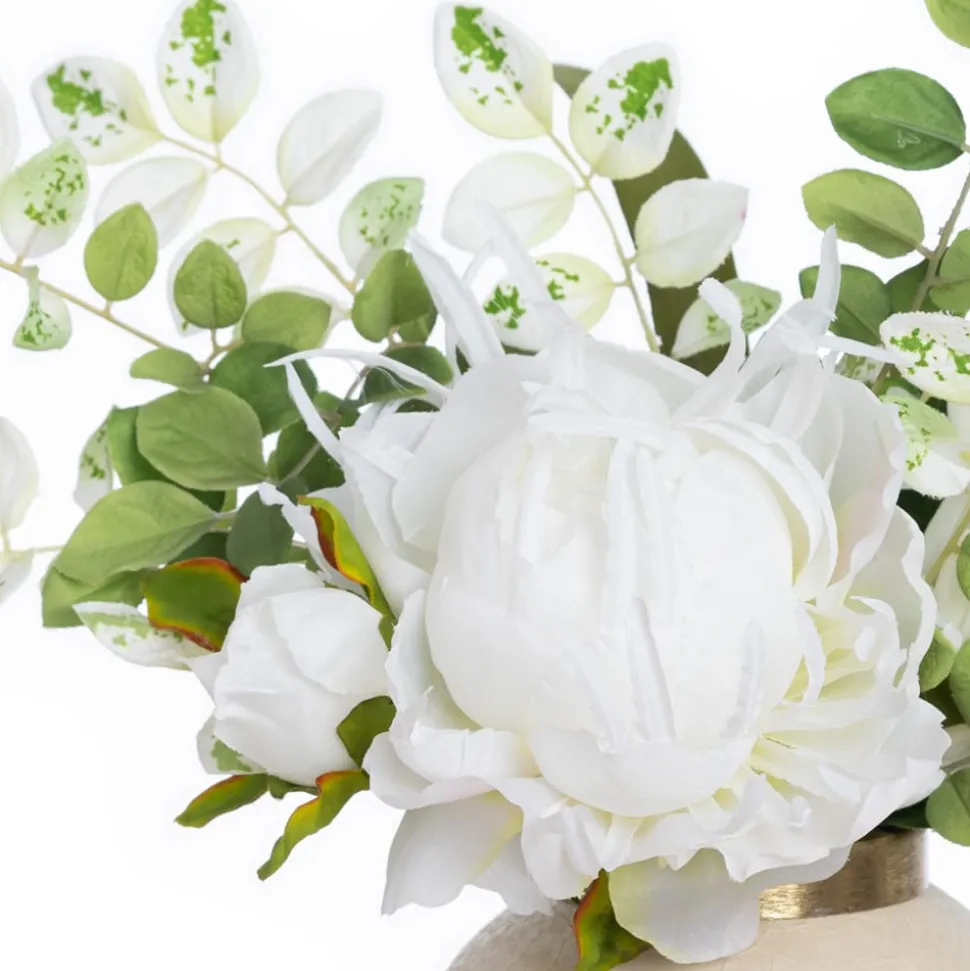 For a sophisticated and refined decoration, go for this magnificent floral arrangement. The union of white peonies with variegated foliage adds charm to its soft, elegant design. Use it as a centerpiece or a wedding table decoration!