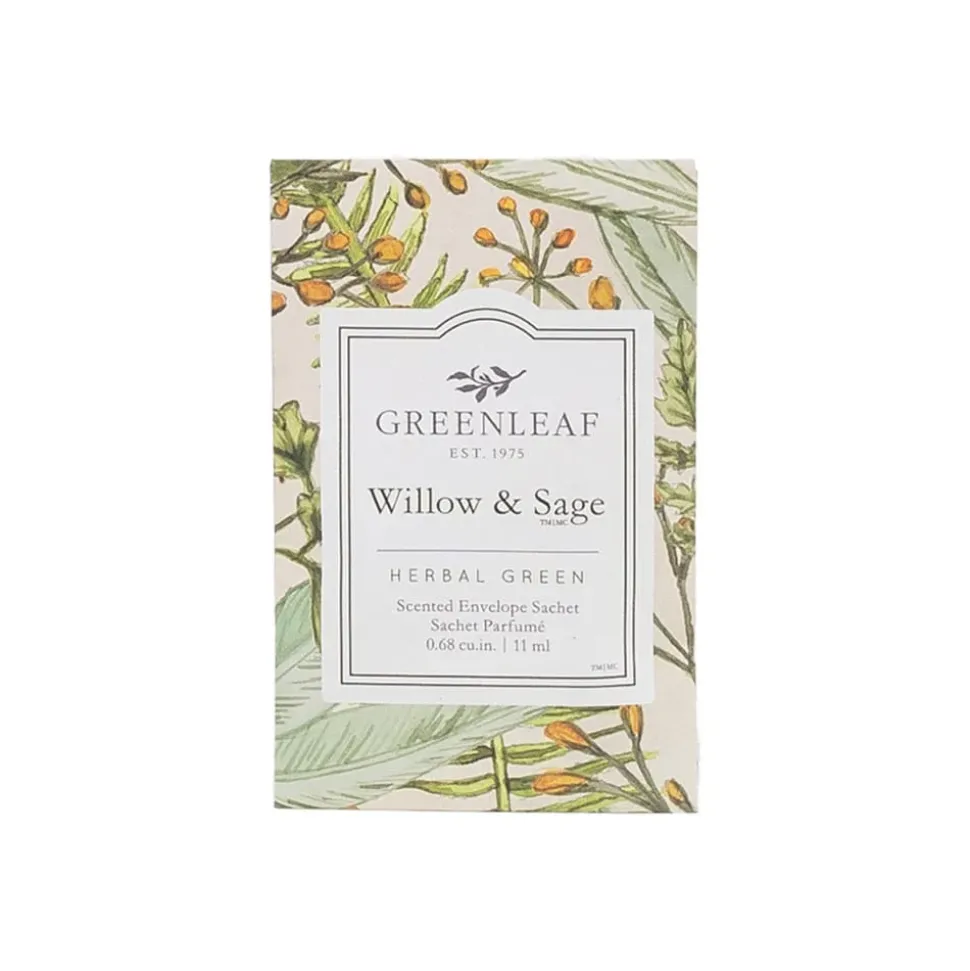 Small Willow & Sage fragrance sachet of 11 ml by Greenleaf. The fresh herbal notes of sage and lavender, softened by sandalwood and reinforced by cedar leaf, create the scent of a warm breeze under a willow tree on a sunny day.