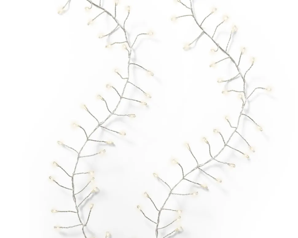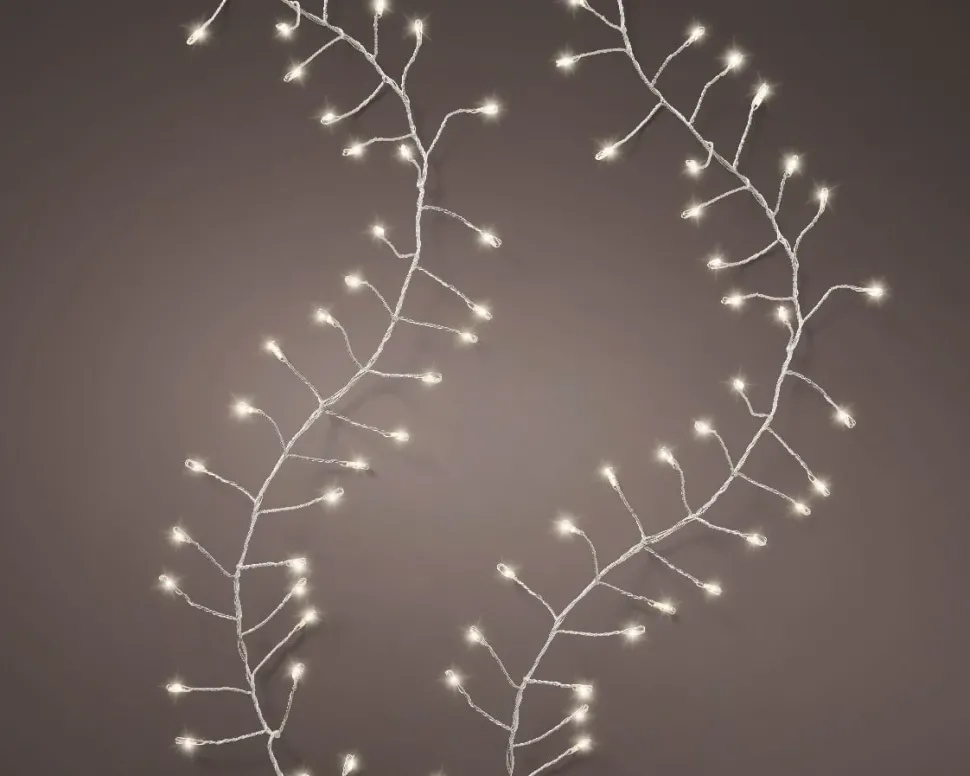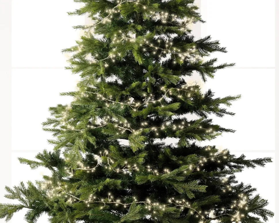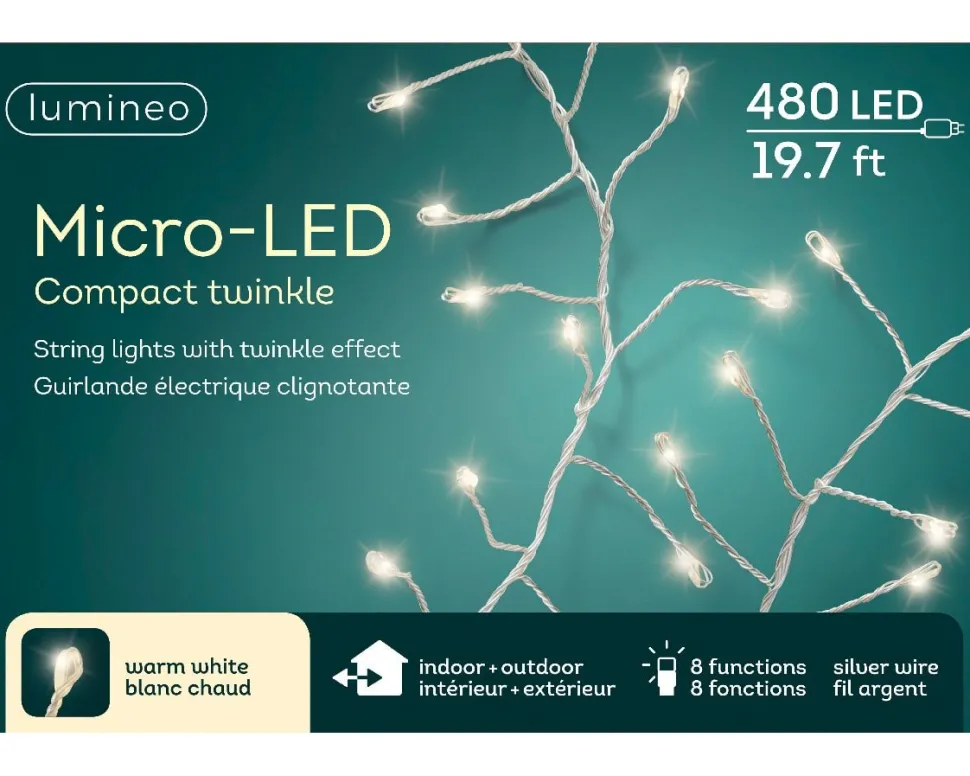 String lights with twinkle effect on silver wire, int./ext., warm white, 19,5′. Made up of 480 LED micro-lights. Its clustered lights will bring a magical effect to your Christmas tree! 8 functions. For indoor or outdoor use.
