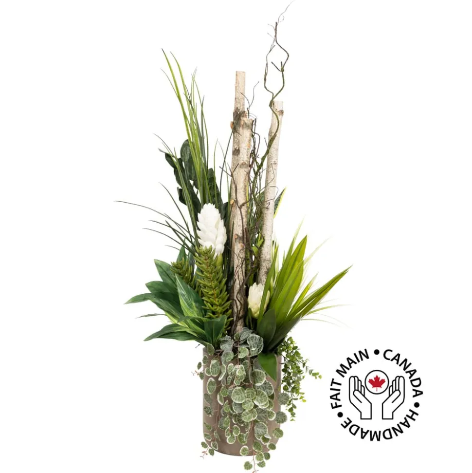 Exclusive creation. This large floral arrangement is a unique mix of tropical plants and birch branches! This original arrangement will enhance your indoor spaces. Since this is a handmade arrangement, the shape of it may vary slightly. Also, please note that not all of our arrangements are necessarily available in store, as they must first be made by our florists. To have it on the same day, it is best to call us before you come.