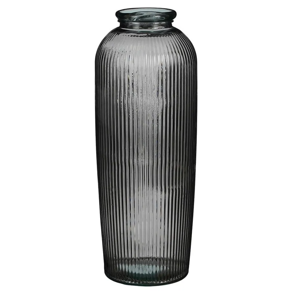 Tall grey ribbed recycled glass floor vase, 27,5 x 12″. Made from high-quality recycled glass, this flower vase embodies our commitment to environmental sustainability. By giving new life to glass, we’re helping to reduce our carbon footprint while creating elegant, functional pieces!