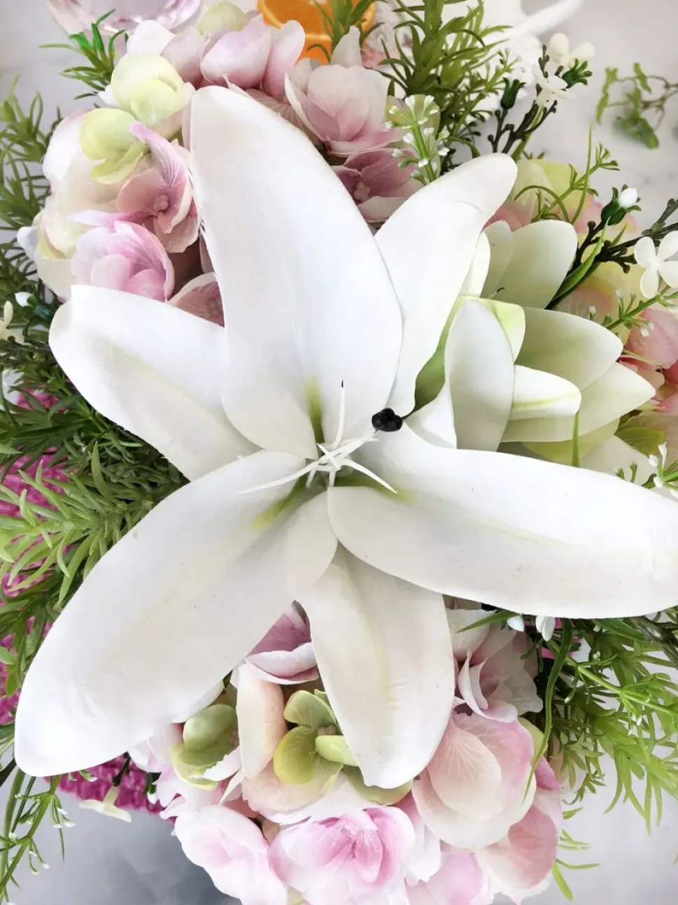 Il n’y a rien de mieux que ce classique lys blanc, d’environ 7 pouces de diamètre pour illuminer un bouquet de fleurs artificielles.