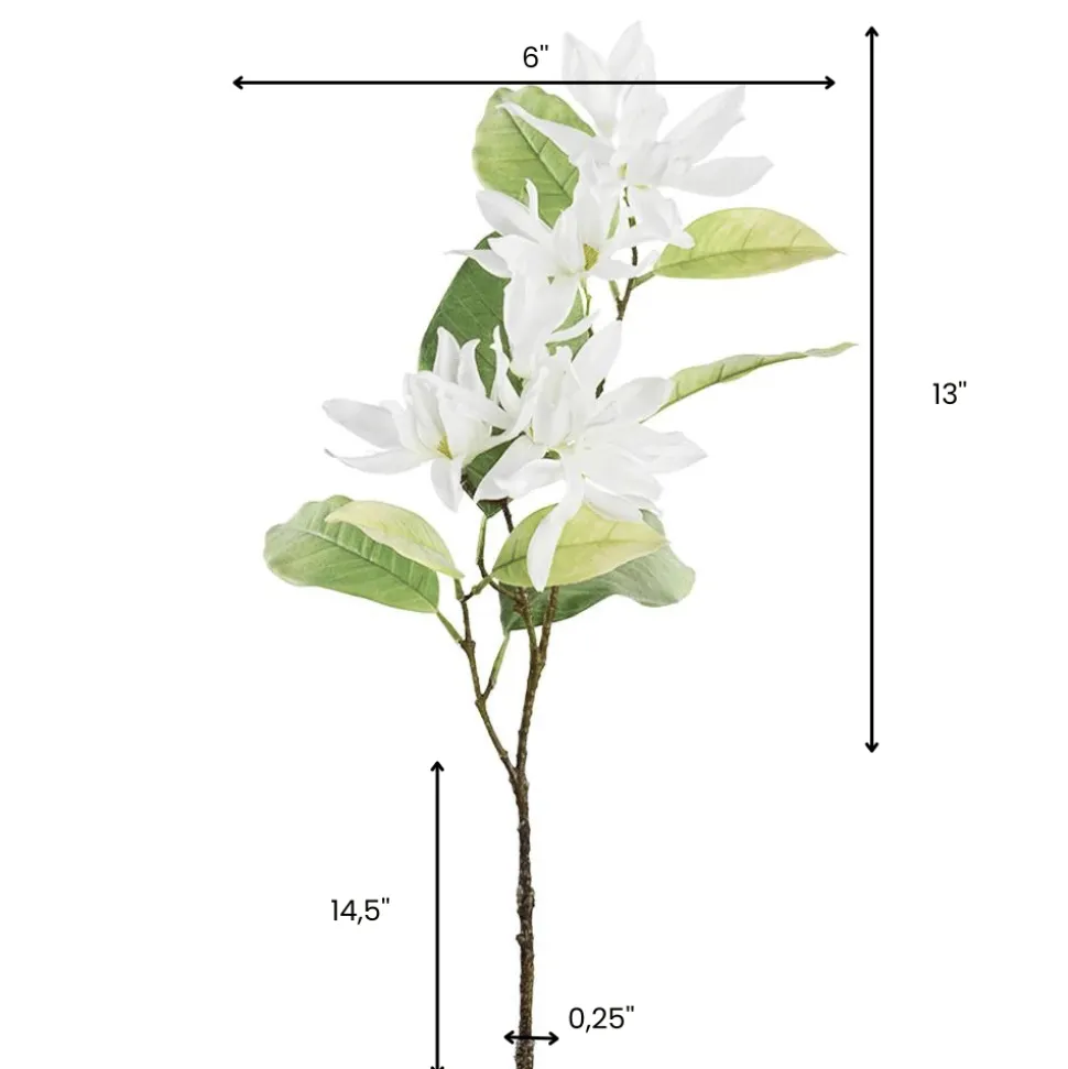 Tige de magnolia blanc artificiel en fleurs, 27,5″. Notre imitation de magnolia vous permet d’orner vos vases, avec ses délicats pétales blancs qui ne se faneront jamais. Elles remplaceront avantageusement les vraies. Utilisez-les comme touche finale dans votre espace ! Aussi proposé en fuchsia.