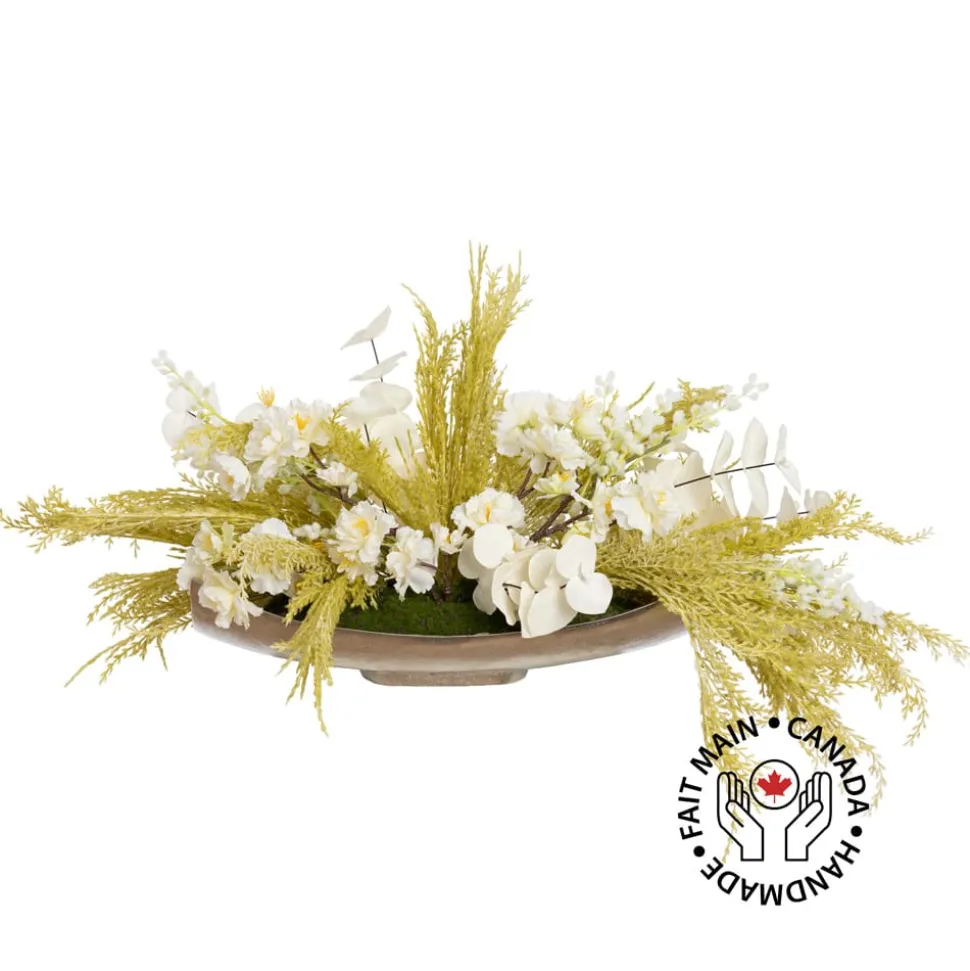 Made of cream cherry blossoms, white eucalyptus, pampas and wild grasses, this arrangement will bring a dose of freshness to your indoor environment! What’s more, since it’s artificial, this yellow-toned centerpiece in a decorative silver bowl will be as beautiful and full as day one.
