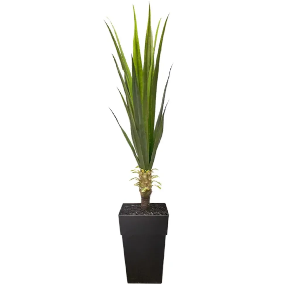 Création Véronneau. Dans tout espace de vie où elle est plantée, cette plante de patio apportera une touche contemporaine. Ce modèle vient dans le pot de plastique montré sur la photo, dans lequel une couche de roche a été ajoutée afin de créer du poids à l’arrangement. La plante a ensuite été fixée dans l’uréthane, puis une couche finale de paillis a été ajoutée en guise de finition.